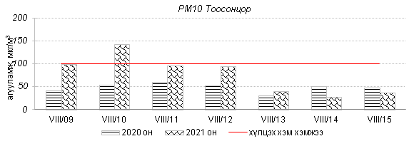 Улаанбаатар хотын агаарт түгээмэл бохирдуулах бодис хүхэрлэг хий /SO2/, азотын давхар исэл /NO2/, тоосонцор /PM10, PM2.5/, нүүрстөрөгчийн дутуу исэл /CO/, озон /O3/-ы агууламжийг тодорхойллоо.