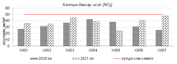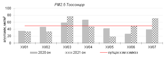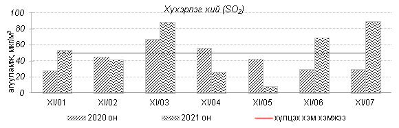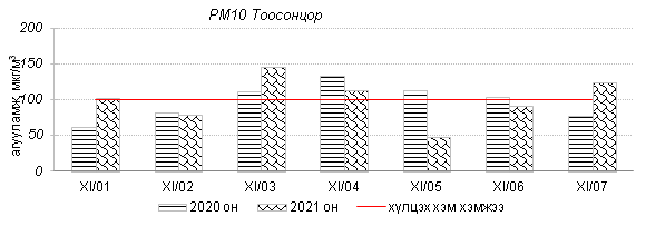 Улаанбаатар хотын агаарт түгээмэл бохирдуулах бодис хүхэрлэг хий /SO2/, азотын давхар исэл /NO2/, тоосонцор /PM10, PM2.5/, нүүрстөрөгчийн дутуу исэл /CO/, озон /O3/-ы агууламжийг тодорхойллоо.