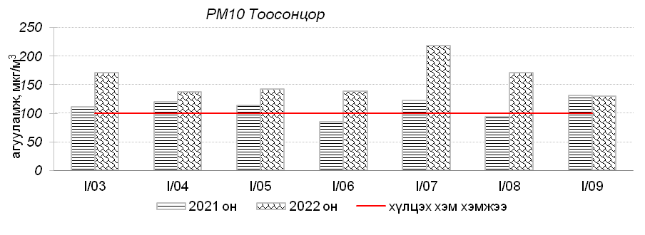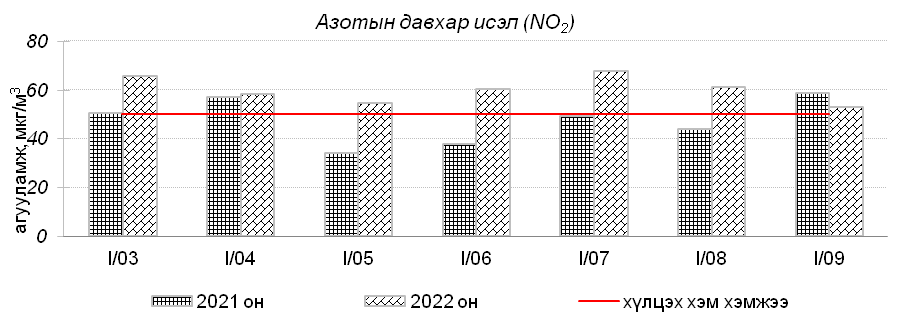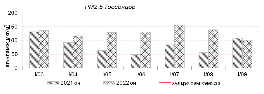 Улаанбаатар хотын агаарт түгээмэл бохирдуулах бодис хүхэрлэг хий /SO2/, азотын давхар исэл /NO2/, тоосонцор /PM10, PM2.5/, нүүрстөрөгчийн дутуу исэл /CO/, озон /O3/-ы агууламжийг тодорхойллоо.