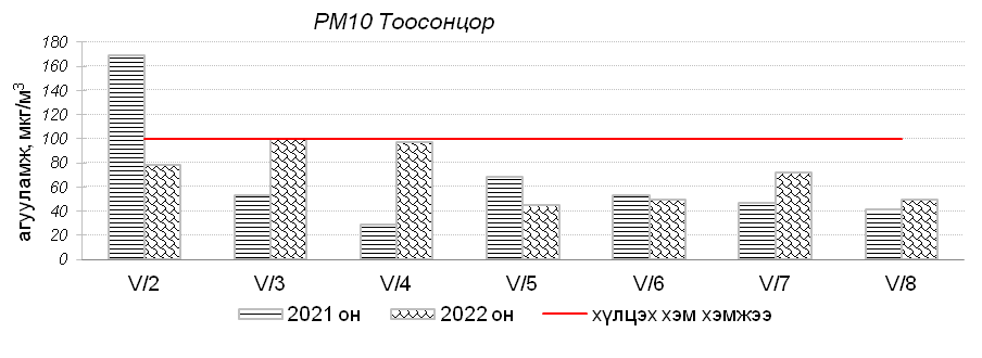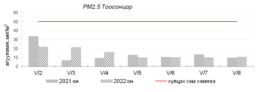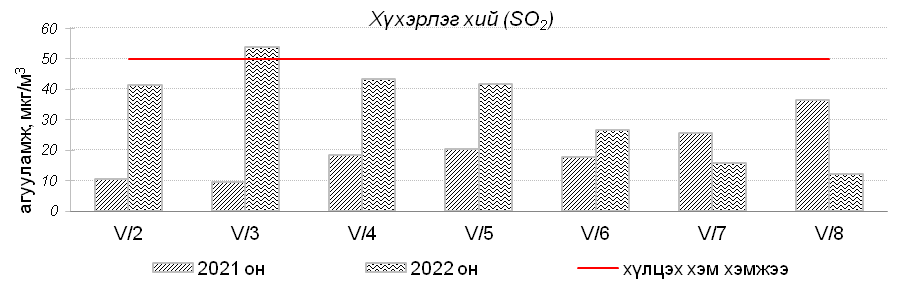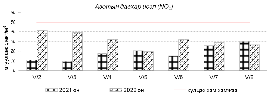 Улаанбаатар хотын агаарт түгээмэл бохирдуулах бодис хүхэрлэг хий /SO2/, азотын давхар исэл /NO2/, тоосонцор /PM10, PM2.5/, нүүрстөрөгчийн дутуу исэл /CO/, озон /O3/-ы агууламжийг тодорхойллоо.