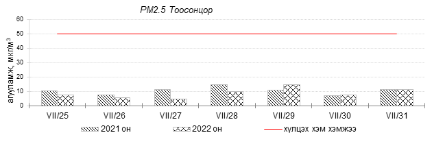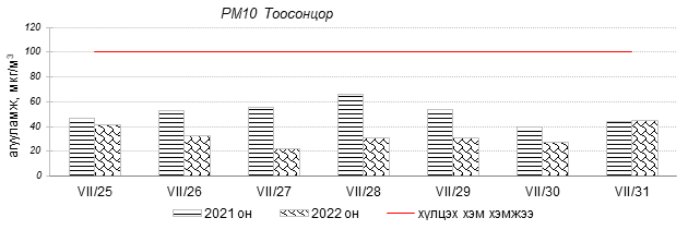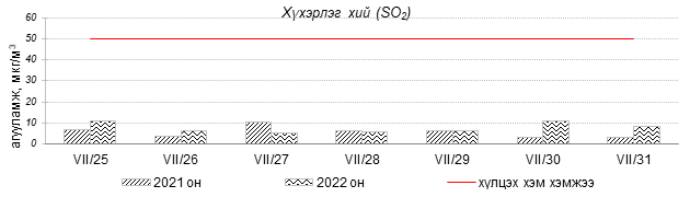 Өнгөрсөн 7 хоног буюу 2022 оны 7 дугаар сарын 25-аас 31-ний өдрийн агаарын чанарын хяналт шинжилгээний дүнгээр Улаанбаатар хотын агаарын чанар 1-р хороолол, 100-н айл, Толгойт, Нисэх, Зурагт, 5-н буудал, 13-р хороолол, Амгалан, Мишээл экспо, Зайсан, Ургах наран хороолол орчим “Цэвэр” болон “Хэвийн”, зарим өдөр Хайлааст, Баруун 4-н зам, Цахилгаан станц орчим “Бага бохирдолтой” түвшинд хүрсэн байна. Дэлгэрэнгүйг эндээс үзнэ үү.