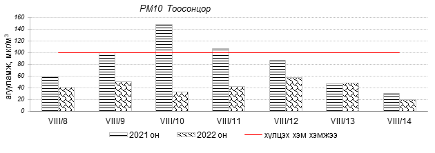 Өнгөрсөн 7 хоног буюу 2022 оны 8 дугаар сарын 08-аас 14-ний өдрийн агаарын чанарын хяналт шинжилгээний дүнгээр Улаанбаатар хотын агаарын чанар “Цэвэр” болон “Хэвийн”, Зарим өдрүүдэд 100-н айл, Баянхошуу, Баруун 4-н зам орчим “Бага бохирдолтой” түвшинд хүрсэн байна. Дэлгэрэнгүйг эндээс үзнэ үү.