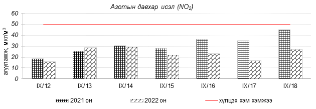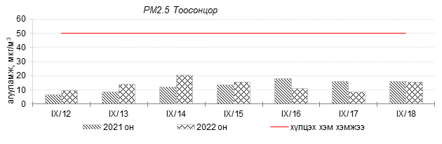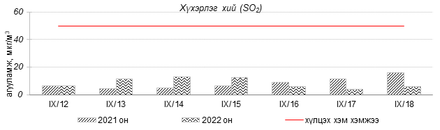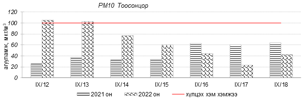 Өнгөрсөн 7 хоног буюу 2022 оны 9 дүгээр сарын 12-оос 18-ны өдрийн агаарын чанарын хяналт шинжилгээний дүнгээр Улаанбаатар хотын агаарын чанар 1-р хороолол, Толгойт, Нисэх, Зурагт, Хайлааст, 5-н буудал, Налайх, 13-р хороолол, Зайсан, орчим “Цэвэр” болон “Хэвийн”, зарим өдрүүдэд 100-н айл, Шархад, Баруун 4-н зам, Амгалан, Цахилгаан станц, Мишээл экспо, Ургах наран хороолол орчим “Бага бохирдолтой” түвшинд хүрсэн байна. Дэлгэрэнгүйг эндээс үзнэ үү.