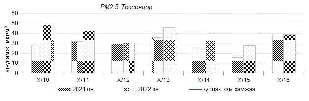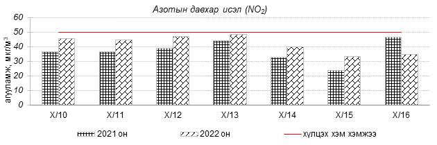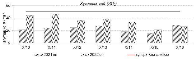 Улаанбаатар хотын агаарт түгээмэл бохирдуулах бодис хүхэрлэг хий /SO2/, азотын давхар исэл /NO2/, тоосонцор /PM10, PM2.5/, нүүрстөрөгчийн дутуу исэл /CO/, озон /O3/-ы агууламжийг тодорхойллоо.