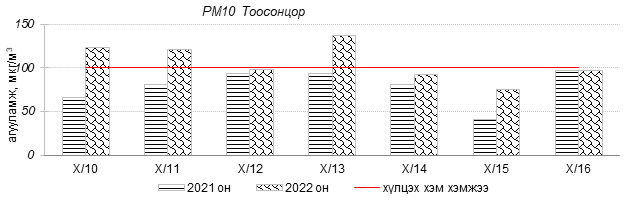 Өнгөрсөн 7 хоногийн буюу 2022 оны 10 дугаар сарын 10-аас 16-ны өдрийн агаарын чанарын хяналт шинжилгээний дүнгээр Улаанбаатар хотын агаарын чанар Налайх Зайсан, Ургах наран хороолол орчим “Цэвэр” болон “Хэвийн”, зарим өдрүүдэд 1-р хороолол, 100-н айл, Нисэх, Баянхошуу, Хайлааст, 5-н буудал, Шархад, 13-р хороолол, Баруун 4-н зам, Амгалан, Цахилгаан станц, Мишээл экспо орчим “Бага бохирдолтой” түвшинд хүрсэн байна. Дэлгэрэнгүйг эндээс үзнэ үү.