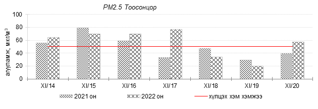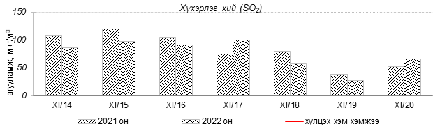 Өнгөрсөн 7 хоногийн агаарын чанарын хяналт шинжилгээний дүнгээр Улаанбаатар хотын агаарын чанар 2022 оны 11 дүгээр сарын 18-аас 20-ны өдрүүдэд 13-р хороолол, Цахилгаан станц, Зайсан, Мишээл экспо орчим “Цэвэр” болон “Хэвийн”, Шархад, Налайх, Ургах наран хороолол, 1-р хороолол, 100-н айл, Толгойт, Нисэх, Зурагт, Хайлааст, 5-н буудал, Баруун 4-н зам, Амгалан, орчим “Бага бохирдолтой”, Баянхошуу орчим “Бохирдолтой” түвшинд хүрсэн байна. Дэлгэрэнгүйг эндээс үзнэ үү.