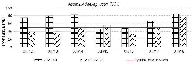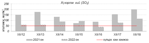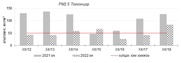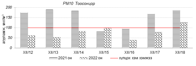 Өнгөрсөн 7 хоногийн агаарын чанарын хяналт шинжилгээний дүнгээр Улаанбаатар хотын агаарын чанар 2022 оны 12 дугаар сарын 12-оос 18-ны өдрүүдэд Цахилгаан станц, Мишээл экспо, Зайсан, Ургах наран хороолол орчим “Цэвэр” болон “Хэвийн”, 13-р хороолол, Амгалан, Налайх, 100-н айл, Толгойт, Нисэх, Баруун 4-н зам, Зурагт, Шархад орчим “Бага бохирдолтой”, 1-р хороолол, Баянхошуу, Хайлааст, 5-н буудал орчим “Бохирдолтой” түвшинд хүрсэн байна. Дэлгэрэнгүйг эндээс үзнэ үү.
