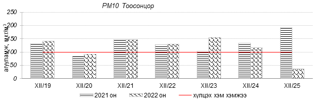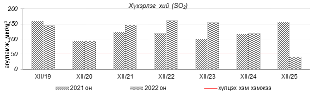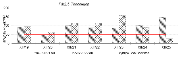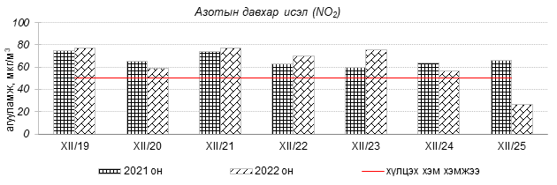 Өнгөрсөн 7 хоногийн агаарын чанарын хяналт шинжилгээний дүнгээр Улаанбаатар хотын агаарын чанар 2022 оны 12 дугаар сарын 19-өөс 25-ны өдрүүдэд Цахилгаан станц, Мишээл экспо, Зайсан, Ургах наран хороолол, 13-р хороолол, Амгалан, Налайх, 100-н айл, Толгойт, Нисэх, Баруун 4-н зам орчим “Бага бохирдолтой”, 1-р хороолол, Зурагт, Шархад орчим “Бохирдолтой”, Хайлааст, 5-н буудал орчим “Их бохирдолтой”, Баянхошуу орчим “Маш их бохирдолтой” түвшинд хүрсэн байна. Дэлгэрэнгүйг эндээс үзнэ үү.