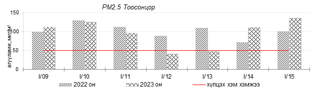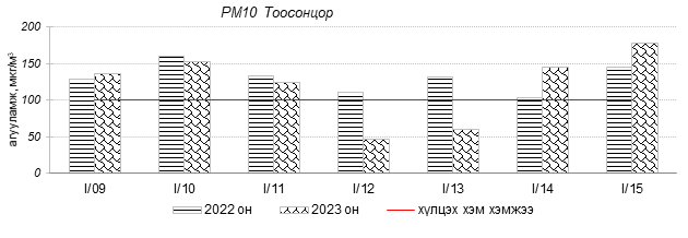 Өнгөрсөн 7 хоногийн агаарын чанарын хяналт шинжилгээний дүнгээр Улаанбаатар хотын агаарын чанар 2023 оны 01 дүгээр сарын 09-өөс 15-ны өдрүүдэд 100-н айл, Толгойт, Нисэх, Налайх, 13-р хороолол, Баруун 4-н зам, Амгалан, Цахилгаан станц, Мишээл экспо, Зайсан, Ургах наран хороолол орчим “Бага бохирдолтой”, 1-р хороолол, Зурагт, 5-н буудал, Шархад орчим “Бохирдолтой”, Хайлааст, Баянхошуу орчим “Их бохирдолтой” түвшинд хүрсэн байна. Дэлгэрэнгүйг эндээс үзнэ үү.