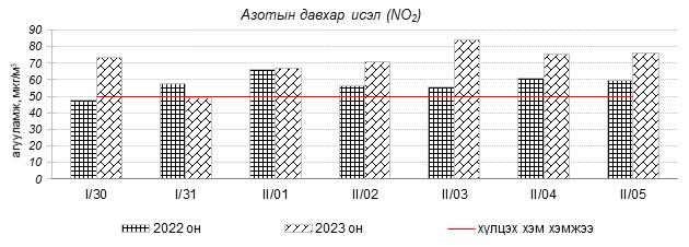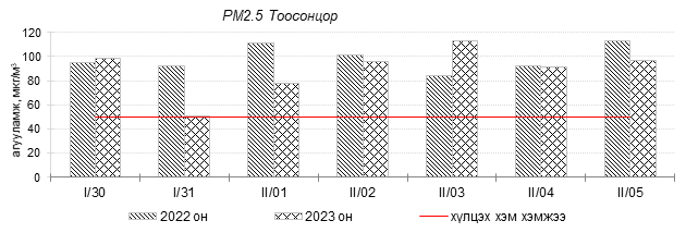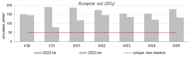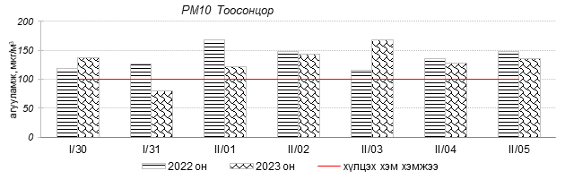 Улаанбаатар хотын агаарын чанар 2023 оны 01 дүгээр сарын 30-аас 02 дугаар сарын 05-ны өдрүүдэд 100-н айл, Толгойт, Нисэх, Зурагт, 13-р хороолол, Баруун 4-н зам, Амгалан, Цахилгаан станц, Мишээл экспо, Зайсан, Ургах наран хороолол орчим “Бага бохирдолтой”, 1-р хороолол, Хайлааст, Баянхошуу, Шархад, Налайх орчим “Бохирдолтой”, 5-н буудал орчим “Их бохирдолтой” түвшинд хүрсэн байна. Дэлгэрэнгүйг эндээс үзнэ үү.