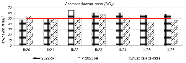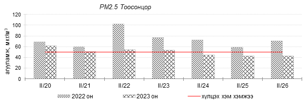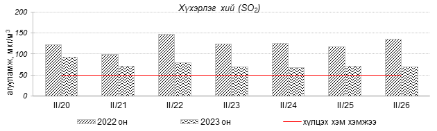 Улаанбаатар хотын агаарын чанар 2023 оны 02 дугаар сарын 20-26-ны өдрүүдэд Амгалан, Цахилгаан станц, Мишээл экспо, Зайсан, Ургах наран хороолол орчим цэвэр болон хэвийн, 1-р хороолол, 100-н айл, Толгойт, Нисэх, Зурагт, Хайлааст, Баянхошуу, 5-н буудал, 13-р хороолол, Баруун 4-н зам, Шархад Налайх орчим “Бага бохирдолтой” түвшинд байсан байна. Дэлгэрэнгүйг эндээс үзнэ үү.