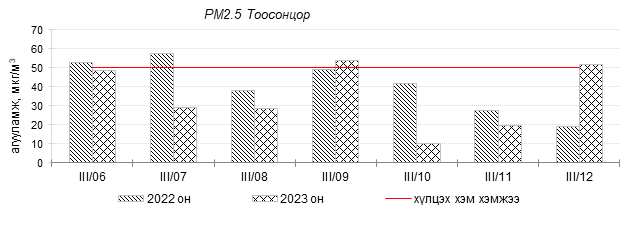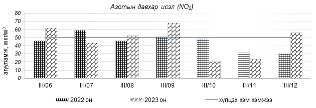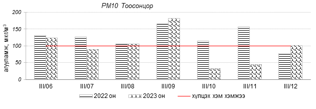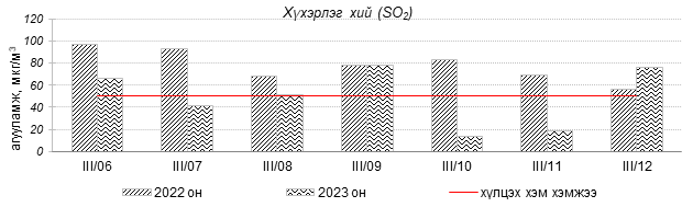Улаанбаатар хотын агаарын чанар 2023 оны 03 дугаар сарын 06-12-ны өдрүүдэд Мишээл экспо, Зайсан, Ургах наран хороолол орчим цэвэр болон хэвийн, 1-р хороолол, 100-н айл, Толгойт, Нисэх, Зурагт, Хайлааст, Баянхошуу, 5-н буудал, 13-р хороолол, Баруун 4-н зам, Шархад, Налайх, Амгалан, орчим “Бага бохирдолтой”, Цахилгаан станц орчим “Бохирдолтой” түвшинд хүрсэн байна. Дэлгэрэнгүйг эндээс үзнэ үү.