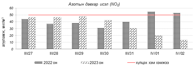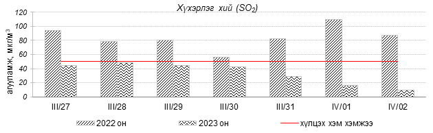 Улаанбаатар хотын агаарын чанар 2023 оны 03 дугаар сарын 27-оос 04 дүгээр сарын 02-ны өдрүүдэд Мишээл экспо, Зайсан, Ургах наран хороолол, Шархад, 5-н буудал, Нисэх орчим цэвэр болон хэвийн, 1-р хороолол, 100-н айл, Толгойт, Зурагт, Хайлааст, 13-р хороолол, Баруун 4-н зам, Налайх, Амгалан, Цахилгаан станц орчим ихэнхдээ “Бага бохирдолтой” түвшинд байсан байна. Дэлгэрэнгүйг эндээс үзнэ үү.