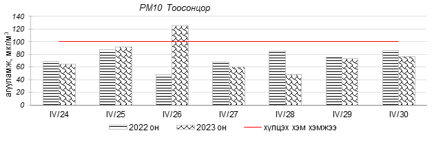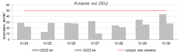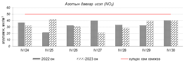 Улаанбаатар хотын агаарын чанар 2023 оны 04 дүгээр сарын 24-30-нд Нисэх, Зурагт, Шархад, Зайсан орчим цэвэр болон хэвийн, бусад цэгүүдэд буюу Хайлааст, Налайх, Мишээл экспо, Ургах наран хороолол 5-н буудал, 1-р хороолол, Толгойт, 13-р хороолол, Баруун 4-н зам, Баянхошуу, Амгалан 100-н айл орчим “Цэвэр”, “Хэвийн” зарим өдрүүдэд “Бага бохирдолтой” түвшинд байсан байна. Дэлгэрэнгүйг эндээс үзнэ үү.