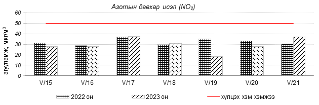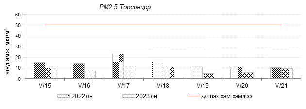 Улаанбаатар хотын агаарын чанар 2023 оны 05 дугаар сарын 15-21-нд Нисэх, Зурагт, Хайлааст, Шархад, Зайсан, Налайх, Мишээл экспо, Ургах наран хороолол 5-н буудал, 1-р хороолол, Толгойт, 13-р хороолол, Амгалан 100-н айл орчим “Цэвэр”, болон “Хэвийн”, Баруун 4-н зам орчим “Бага бохирдолтой” түвшинд байсан байна. Дэлгэрэнгүйг эндээс үзнэ үү.