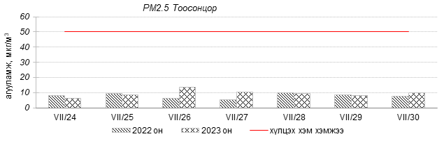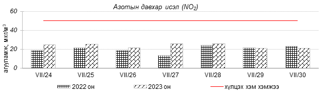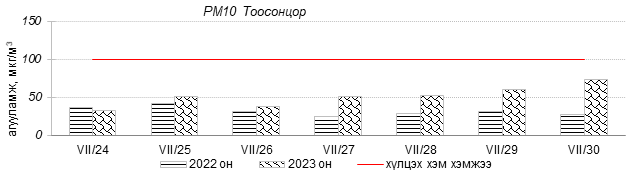 Улаанбаатар хотын агаарын чанар 2023 оны 07 дугаар сарын 24-30-ны өдрүүдэд Толгойт, Нисэх, Зурагт, Зайсан, Хайлааст, 5-н буудал, Шархад, Налайх, 1-р хороолол, ,13-р хороолол, Мишээл экспо, Ургах наран хороолол, орчим “Цэвэр” болон “Хэвийн”, 100-н айл, Баянхошуу, Баруун 4-н зам, Амгалан,Цахилгаан станц орчим “Бага бохирдолтой” түвшинд байсан байна. Дэлгэрэнгүйг доорх хавсралт файлаас үзнэ үү?