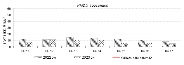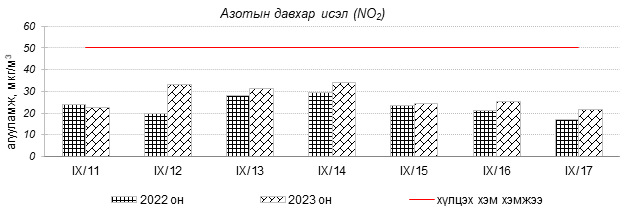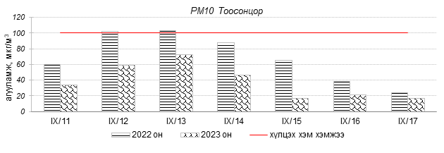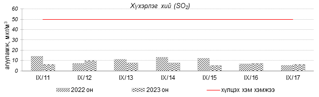 Улаанбаатар хотын агаарын чанар 2023 оны 09 дүгээр сарын 11-17-нд 100-н айл, Толгойт, Нисэх, Зурагт, 1-р хороолол, Зайсан, Хайлааст, 5-н буудал, Шархад, Налайх, 13-р хороолол, Мишээл экспо, Ургах наран хороолол, Амгалан, Цахилгаан станц, Баянхошуу орчим “Цэвэр” болон “Хэвийн”, харин Баруун 4-н зам орчим “Бага бохирдолтой” түвшинд хүрсэн байна. Дэлгэрэнгүйг эндээс үзнэ үү.