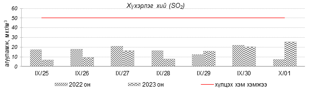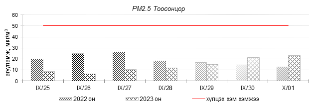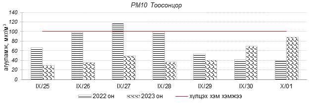 Улаанбаатар хотын агаарын чанар 2023 оны 09 дүгээр сарын 25-аас 10 дугаар сарын 01-нд 100-н айл, Толгойт, Нисэх, Зурагт, Зайсан, Хайлааст, 5-н буудал, Шархад, Налайх, 13-р хороолол, Мишээл экспо, Ургах наран хороолол, Амгалан, Баянхошуу орчим “Цэвэр” болон “Хэвийн”, зарим өдрүүдэд Цахилгаан станц, 1-р хороолол, Баруун 4-н зам орчим “Бага бохирдолтой” түвшинд байсан байна. Дэлгэрэнгүйг эндээс үзнэ үү.