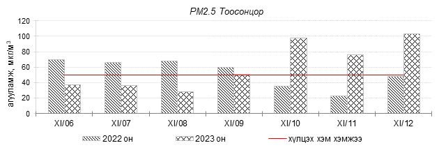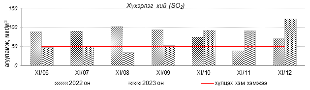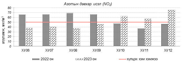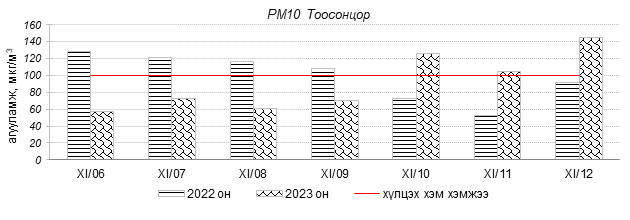 Улаанбаатар хотын агаарын чанарын индексийн мэдээгээр 2023 оны 11 дүгээр сарын 06-12-ны өдрүүдэд 100-н айл, Цахилгаан станц, Шархад, Зайсан, Толгойт, Нисэх, Налайх, Мишээл экспо, 13-р хороолол, Амгалан, Ургах наран хороолол, 5-н буудал, Зурагт, Баруун 4-н зам орчим “Бага бохирдолтой” зарим өдөр 1-р хороолол, Баянхошуу, Хайлааст орчим “Бохирдолтой” түвшинд хүрсэн байна. Дэлгэрэнгүйг эндээс үзнэ үү.
