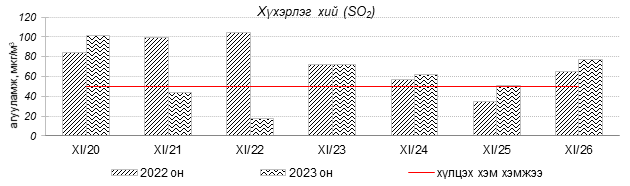 Улаанбаатар хотын агаарын чанарын индексийн мэдээгээр 2023 оны 11 дүгээр сарын 20-26-ны өдрүүдэд Мишээл экспо, Зайсан орчим “Цэвэр” болон “Хэвийн”, харин 100-н айл, Цахилгаан станц, Шархад, Толгойт, Нисэх, Налайх, 13-р хороолол, Амгалан, Ургах наран хороолол, 5-н буудал, 1-р хороолол, Зурагт, Баруун 4-н зам орчим “Бага бохирдолтой” харин зарим өдөр Хайлааст, Баянхошуу орчим “Бохирдолтой” түвшинд хүрсэн байна. Дэлгэрэнгүйг эндээс үзнэ үү.