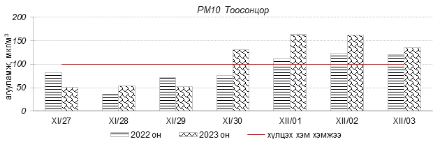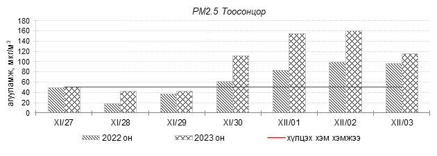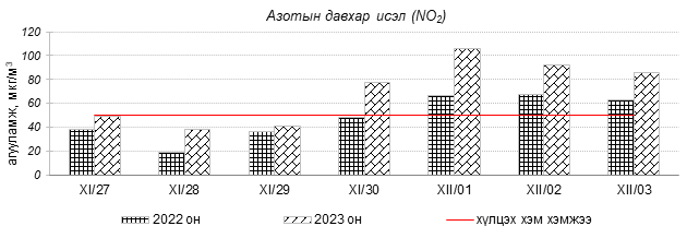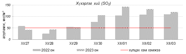 Улаанбаатар хотын агаарын чанарын индексийн мэдээгээр 2023 оны 11 дүгээр сарын 27-оос 12 дугаар сарын 03-ны өдрүүдэд Мишээл экспо, Зайсан, 100-н айл, Цахилгаан станц, Шархад, Толгойт, Нисэх, Налайх, 13-р хороолол, Амгалан, Ургах наран хороолол, 5-н буудал, 1-р хороолол орчим “Бага бохирдолтой”, Зурагт, Баруун 4-н зам орчим “Бохирдолтой”, Хайлааст орчим “Их бохирдолтой”, Баянхошуу орчим “Маш их бохирдолтой” түвшинд хүрсэн байна. Дэлгэрэнгүйг эндээс үзнэ үү.