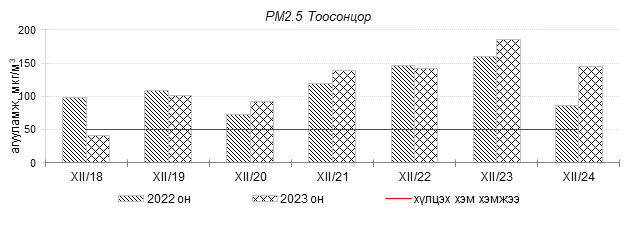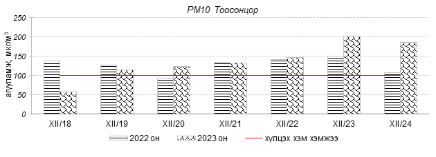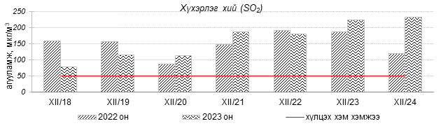 Улаанбаатар хотын агаарын чанарын индексийн мэдээгээр 2023 оны 12 дугаар сарын 18-24-ний өдрүүдэд Толгойт, Нисэх, 13-р хороолол, Амгалан, Ургах наран хороолол, Зайсан, Мишээл экспо, Цахилгаан станц, Баруун 4-н зам орчим “Бага бохирдолтой”, 1-р хороолол, 100-н айл, Шархад, Зурагт, Налайх, 5-н буудал орчим “Бохирдолтой”, Хайлааст орчим “Их бохирдолтой”, Баянхошуу орчим “Маш их бохирдолтой” түвшинд хүрсэн байна. Дэлгэрэнгүйг эндээс үзнэ үү.