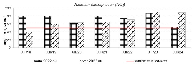 Улаанбаатар хотын агаарт түгээмэл бохирдуулах бодис хүхэрлэг хий /SO2/, азотын давхар исэл /NO2/, тоосонцор /PM10, PM2.5/, нүүрстөрөгчийн дутуу исэл /CO/, озон /O3/-ны агууламжийг тодорхойллоо.