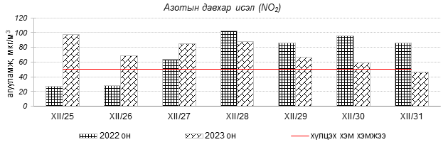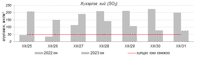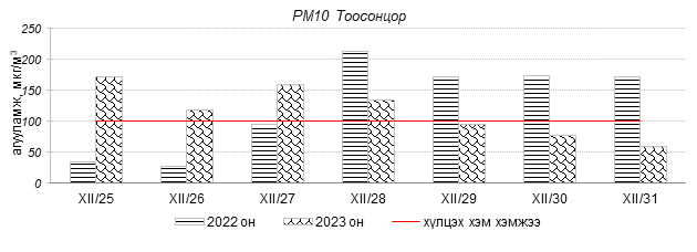 Улаанбаатар хотын агаарын чанарын индексийн мэдээгээр 2023 оны 12 дугаар сарын 25-31-ний өдрүүдэд Толгойт, Нисэх, 13-р хороолол, Амгалан, Ургах наран хороолол, Зайсан, Мишээл экспо, Налайх, 5-н буудал, Цахилгаан станц, Баруун 4-н зам орчим “Бага бохирдолтой”, 1-р хороолол, 100-н айл, Шархад, Зурагт орчим “Бохирдолтой”, Хайлааст орчим “Их бохирдолтой”, Баянхошуу орчим “Маш их бохирдолтой” түвшинд хүрсэн байна. Дэлгэрэнгүйг эндээс үзнэ үү.