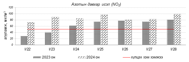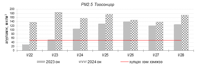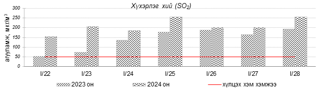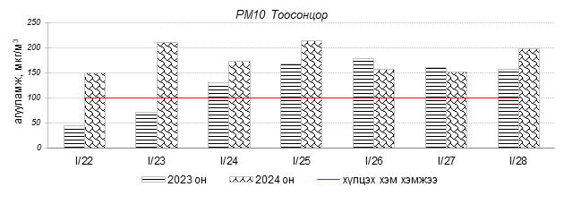 Улаанбаатар хотын агаарын чанарын индексийн мэдээгээр 2024 оны 01 дүгээр сарын 22-28-ны өдрүүдэд Зайсан, Толгойт, Нисэх, 13-р хороолол, Баруун 4-н зам, Амгалан, Ургах наран хороолол, Мишээл экспо, Цахилгаан станц орчим “Бага бохирдолтой”, Налайх, 100-н айл, Зурагт, Шархад орчим “Бохирдолтой”, 1-р хороолол, Дамбадаржаа, 5-н буудал орчим “Их бохирдолтой”, Хайлааст, Баянхошуу орчим “Маш их бохирдолтой” түвшинд хүрсэн байна. Дэлгэрэнгүйг эндээс үзнэ үү.