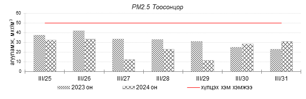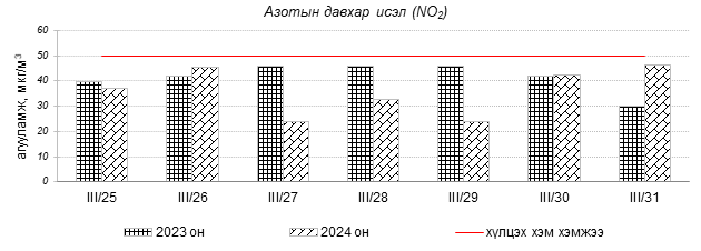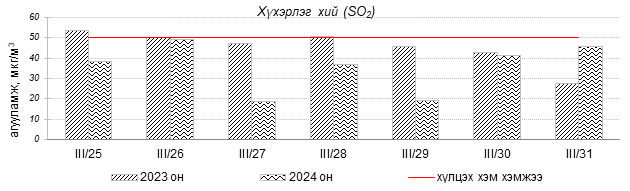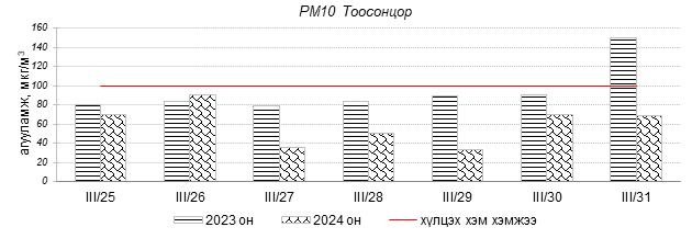 Улаанбаатар хотын агаарын чанарын индексийн мэдээгээр 2024 оны 03 дугаар сарын 25-31-ний өдрүүдэд Зайсан, Мишээл экспо, Баянхошуу, Нисэх орчим “Цэвэр” болон “Хэвийн”, 13-р хороолол, Толгойт, Баруун 4-н зам, Налайх, 100-н айл, Амгалан, 5-н буудал, Ургах наран хороолол, Хайлааст, Зурагт, 1-р хороолол, Дамбадаржаа, Шархад орчим “Бага бохирдолтой” түвшинд байсан байна. Дэлгэрэнгүйг эндээс үзнэ үү.