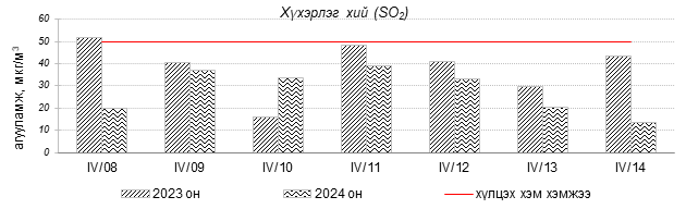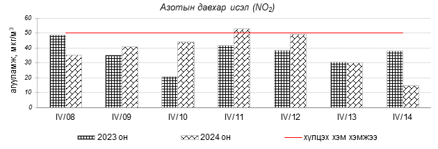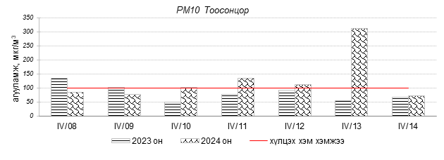 Улаанбаатар хотын агаарын чанарын индексийн мэдээгээр 2024 оны 04 дүгээр сарын 08-14-ний өдрүүдэд Зайсан, Баянхошуу орчим “Цэвэр” болон “Хэвийн”, Нисэх, Мишээл экспо, Толгойт, Баруун 4-н зам, Амгалан, 5-н буудал, Ургах наран хороолол, Хайлааст, Зурагт, 1-р хороолол, Дамбадаржаа, Шархад орчим “Бага бохирдолтой”, 04 сарын 13-ны өдрийн хүчтэй шороон шуурганы улмаас 100-н айл орчим “Их бохирдолтой”, Налайх, 13-р хороолол орчим “Маш их бохирдолтой” түвшинд хүрсэн байна. Дэлгэрэнгүйг эндээс үзнэ үү.