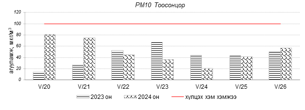 Улаанбаатар хотын агаарын чанарын индексийн мэдээгээр 2024 оны 05 дугаар сарын 20-26-ны өдрүүдэд Мишээл экспо, Зайсан, 13-р хороолол, Толгойт, Зурагт, Нисэх, Хайлааст орчим “Цэвэр” болон “Хэвийн”, харин Шархад, 100-н айл, Налайх, 1-р хороолол, Баруун 4-н зам, Амгалан, Ургах наран хороолол орчим “Бага бохирдолтой” түвшинд хүрсэн байна. Дэлгэрэнгүйг эндээс үзнэ үү.