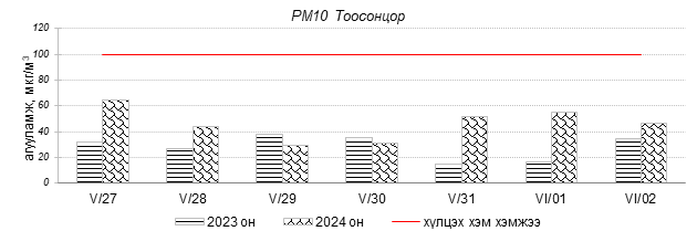 Улаанбаатар хотын агаарын чанарын индексийн мэдээгээр 2024 оны 05 дугаар сарын 27-оос 06 дугаар сарын 02-ны өдрүүдэд Мишээл экспо, Шархад, Зайсан, 13-р хороолол, Налайх, 1-р хороолол, Толгойт, Зурагт, Нисэх, Хайлааст, Ургах наран хороолол орчим “Цэвэр” болон “Хэвийн”, харин 100-н айл, Баруун 4-н зам, Амгалан орчим “Бага бохирдолтой” түвшинд хүрсэн байна. Дэлгэрэнгүйг эндээс үзнэ үү.
