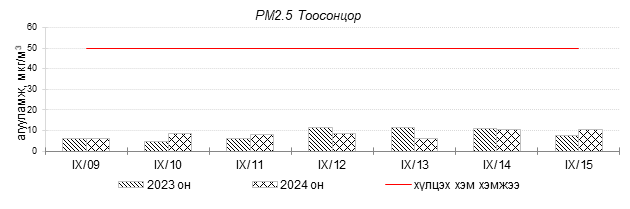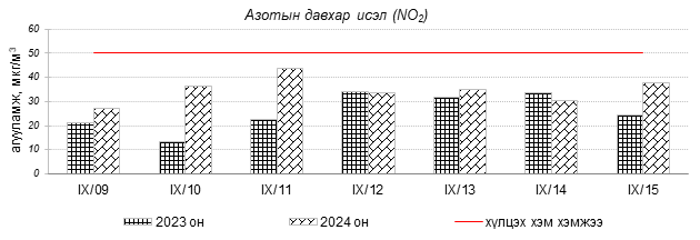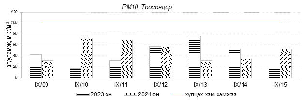 Улаанбаатар хотын агаарын чанарын индексийн мэдээгээр 2024 оны 09 дүгээр сарын 09-15-ны өдрүүдэд Мишээл экспо, Зайсан, Шархад, 13-р хороолол, Ургах наран хороолол, Толгойт, Дамбадаржаа, Зурагт, 5-н буудал, Нисэх, Баянхошуу, Налайх, Хайлааст орчим “Цэвэр” болон “Хэвийн”, харин 1-р хороолол, 100-н айл, Баруун 4-н зам орчим “Бага бохирдолтой” түвшинд хүрсэн байна. Дэлгэрэнгүйг эндээс үзнэ үү.