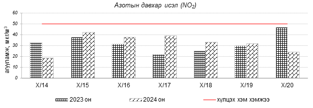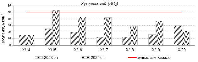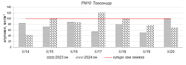 Улаанбаатар хотын агаарын чанарын индексийн мэдээгээр 2024 оны 10 дугаар сарын 14-20-ны өдрүүдэд Зурагт, Налайх, 13-р хороолол, Зайсан орчим “Цэвэр” болон “Хэвийн”, Дамбадаржаа, Мишээл экспо, Шархад, Нисэх, Ургах наран хороолол, Толгойт, 1-р хороолол, 100-н айл, Хайлааст, Баруун 4-н зам, Баянхошуу, орчим “Бага бохирдолтой”, харин Цахилгаан станц орчим “Бохирдолтой” түвшинд хүрсэн байна. Дэлгэрэнгүйг эндээс үзнэ үү.