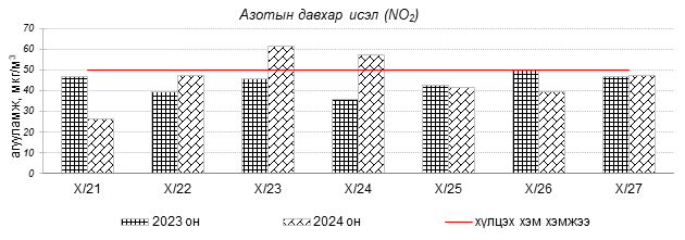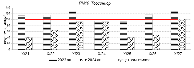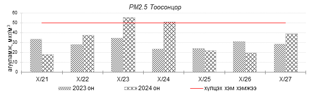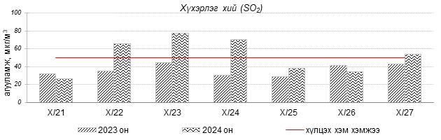 Улаанбаатар хотын агаарын чанарын индексийн мэдээгээр 2024 оны 10 дугаар сарын 21-27-ны өдрүүдэд Мишээл экспо орчим “Цэвэр” болон “Хэвийн”, Зурагт, 5-н буудал, Налайх, 13-р хороолол, Амгалан, Зайсан, Дамбадаржаа, Шархад, Нисэх, Ургах наран хороолол, Толгойт, 1-р хороолол, 100-н айл, Хайлааст, Баруун 4-н зам, Баянхошуу, Цахилгаан станц орчим “Бага бохирдолтой” түвшинд байсан байна. Дэлгэрэнгүйг эндээс үзнэ үү.