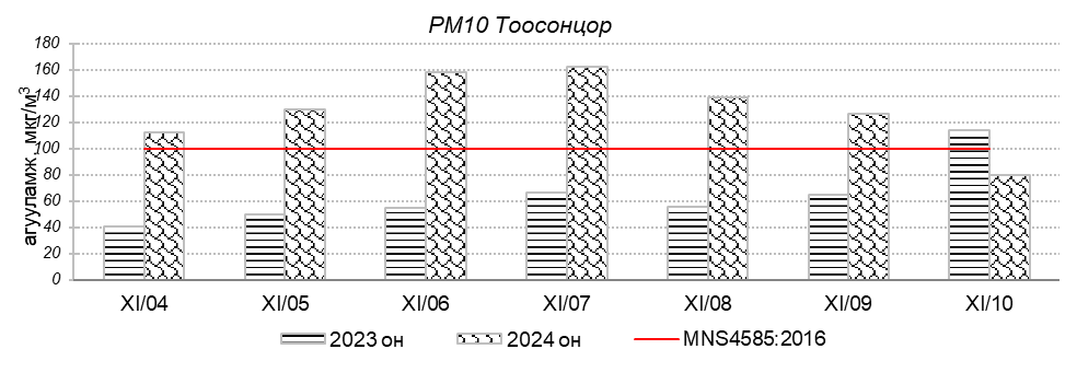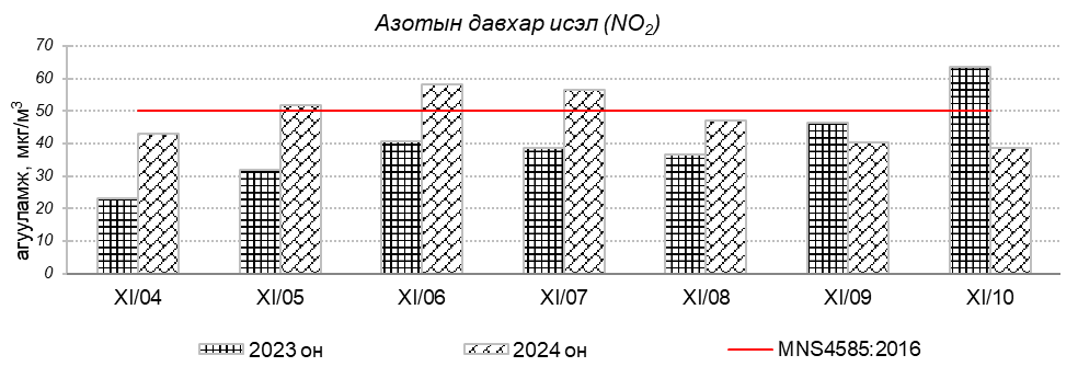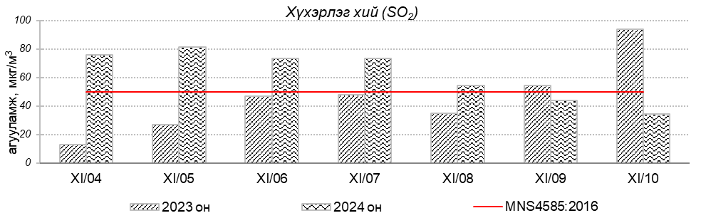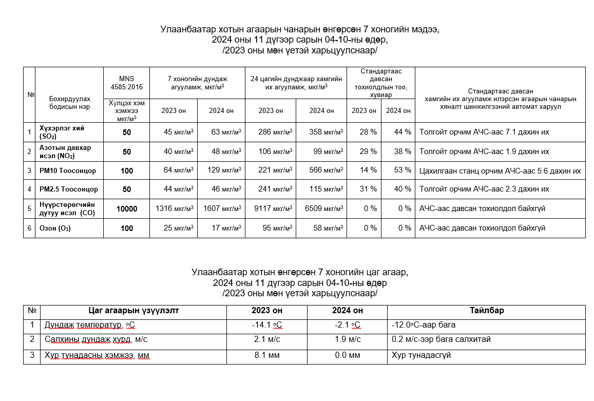 Улаанбаатар хотын агаарт түгээмэл бохирдуулах бодис хүхэрлэг хий /SO2/, азотын давхар исэл /NO2/, тоосонцор /PM10, PM2.5/, нүүрстөрөгчийн дутуу исэл /CO/, озон /O3/-ны агууламжийг тодорхойллоо.