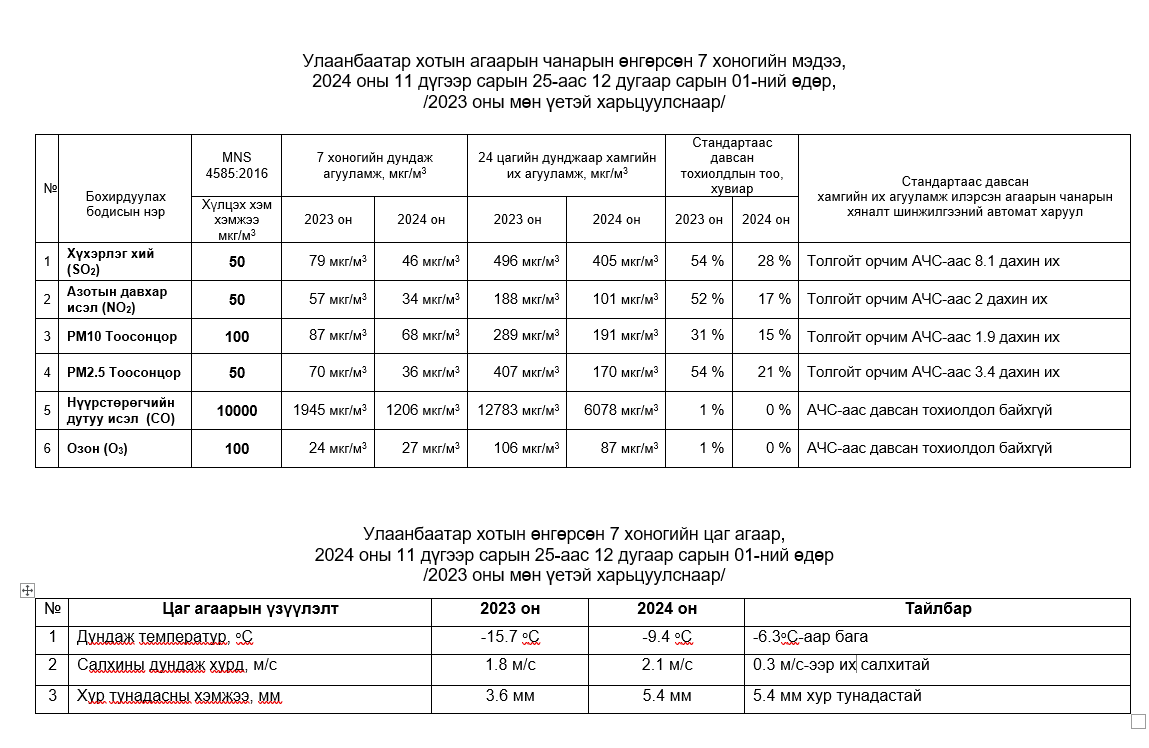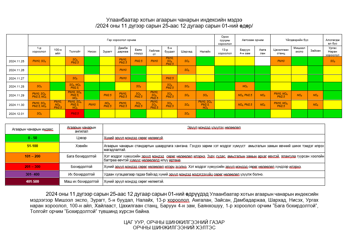 Улаанбаатар хотын агаарын чанарын 7 хоногийн мэдээ /2024.11.25-2024.12.01/