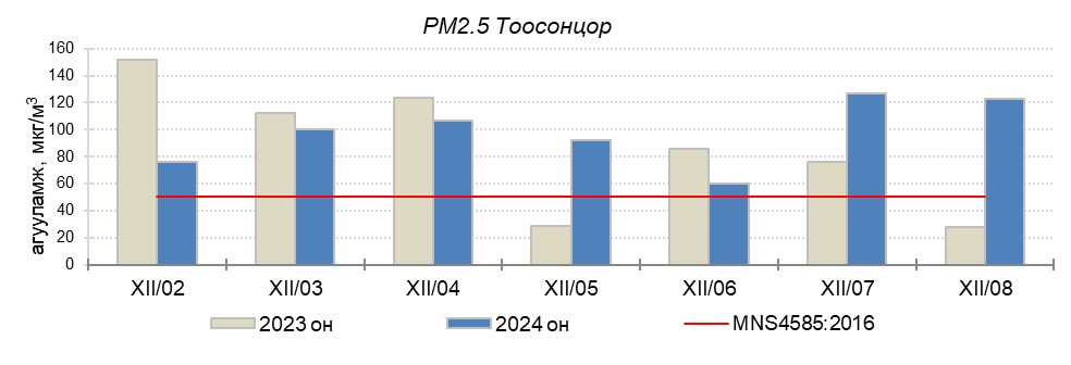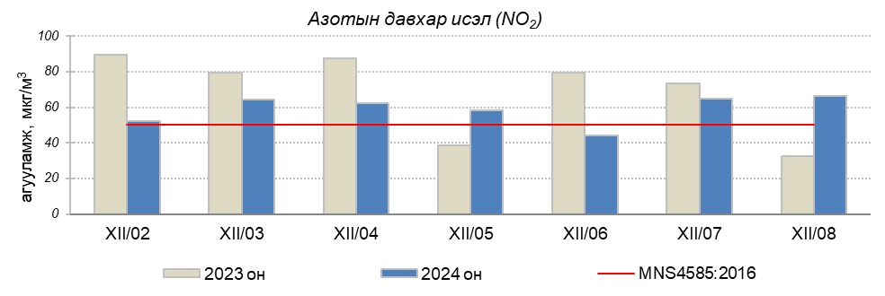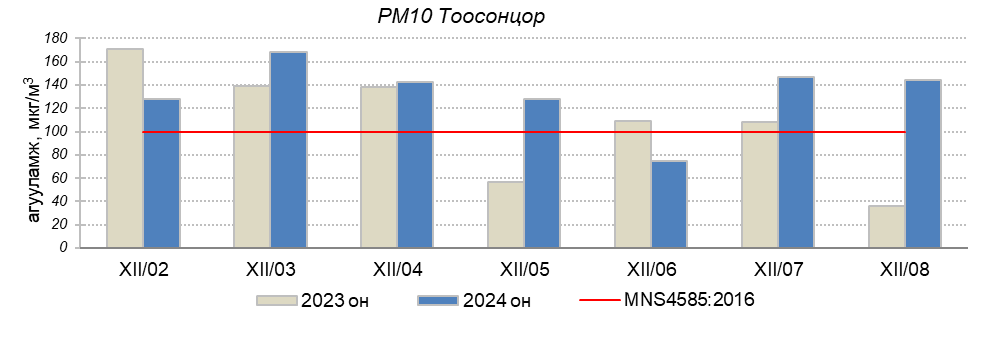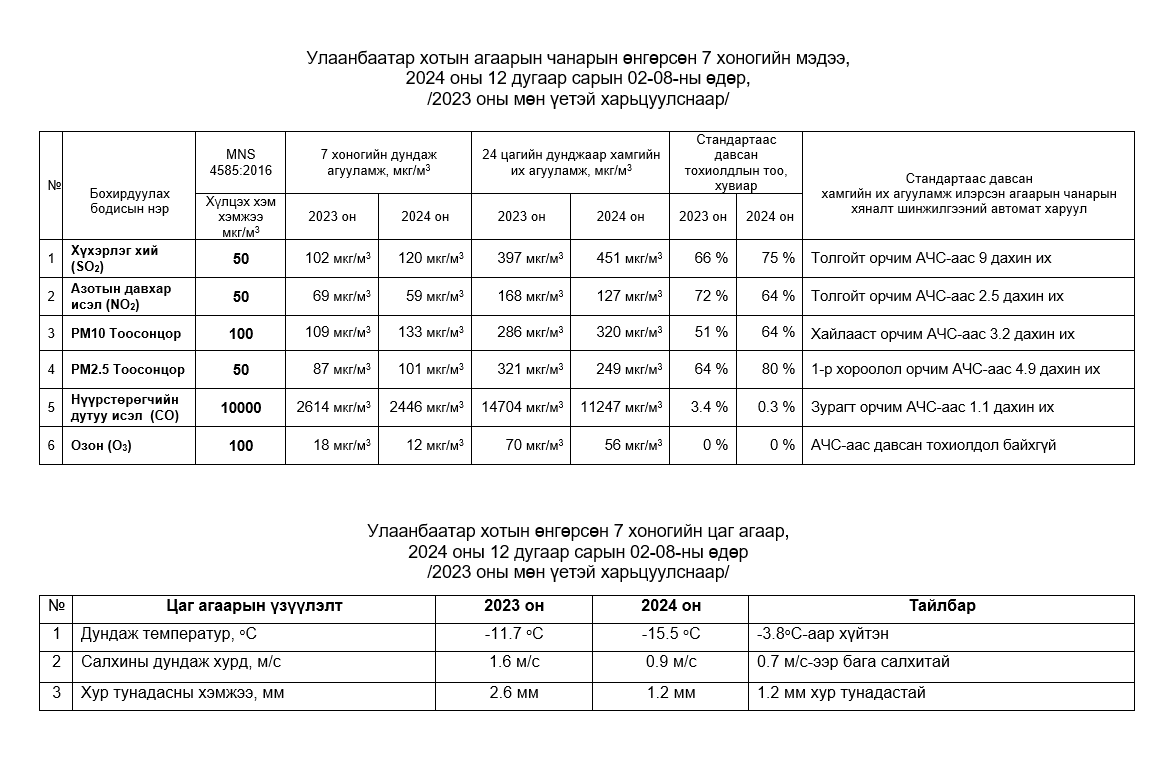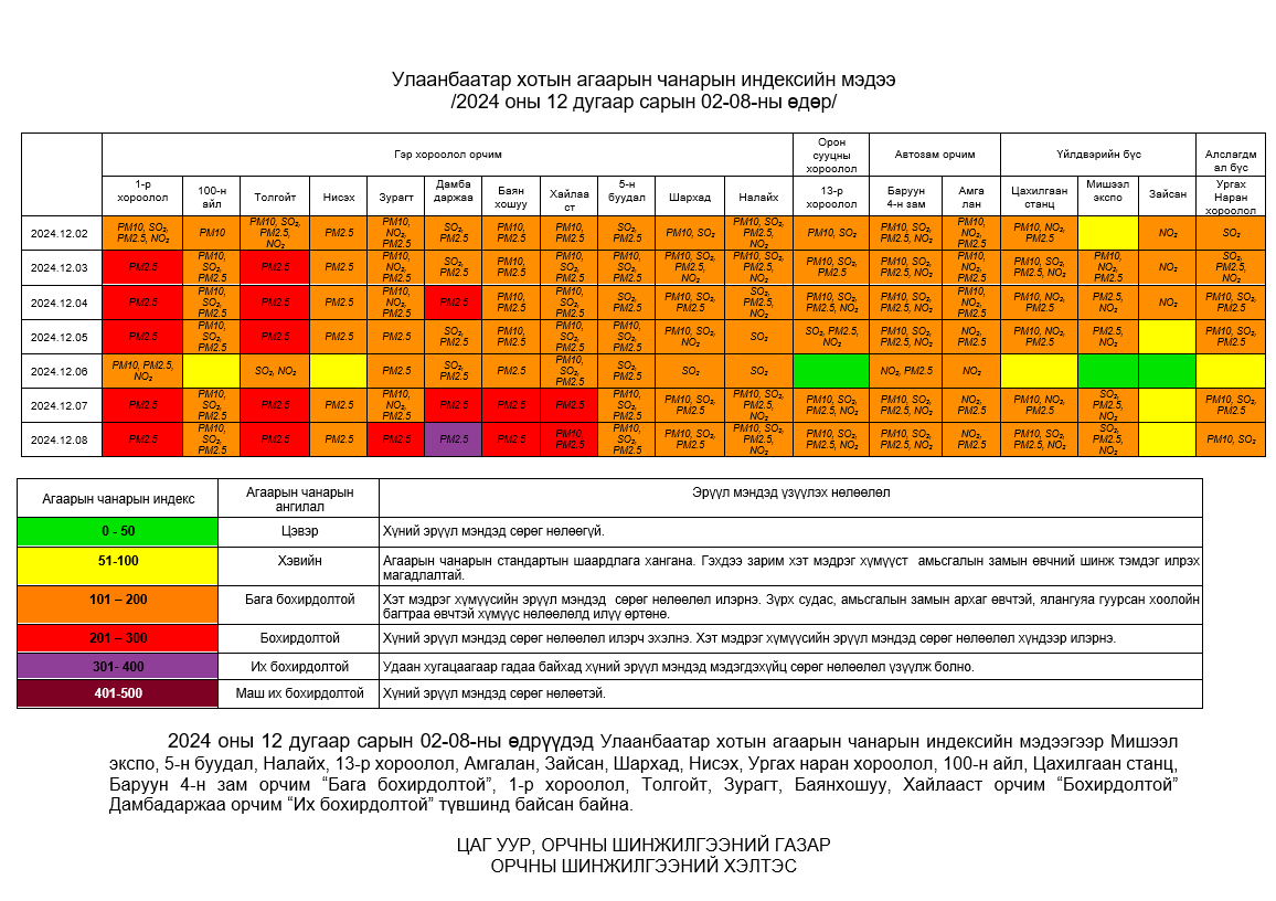 Улаанбаатар хотын агаарт түгээмэл бохирдуулах бодис хүхэрлэг хий /SO2/, азотын давхар исэл /NO2/, тоосонцор /PM10, PM2.5/, нүүрстөрөгчийн дутуу исэл /CO/, озон /O3/-ны агууламжийг тодорхойллоо.