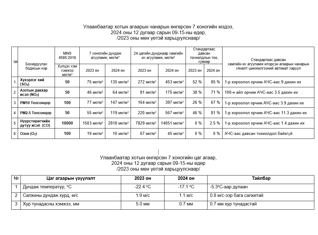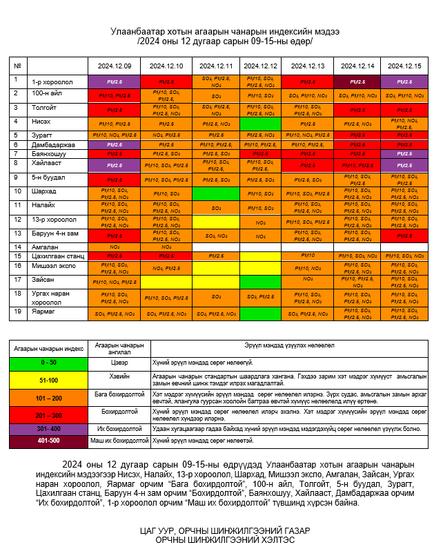 Улаанбаатар хотын агаарын чанарын 7 хоногийн мэдээ /2024.12.09-2024.12.15/
