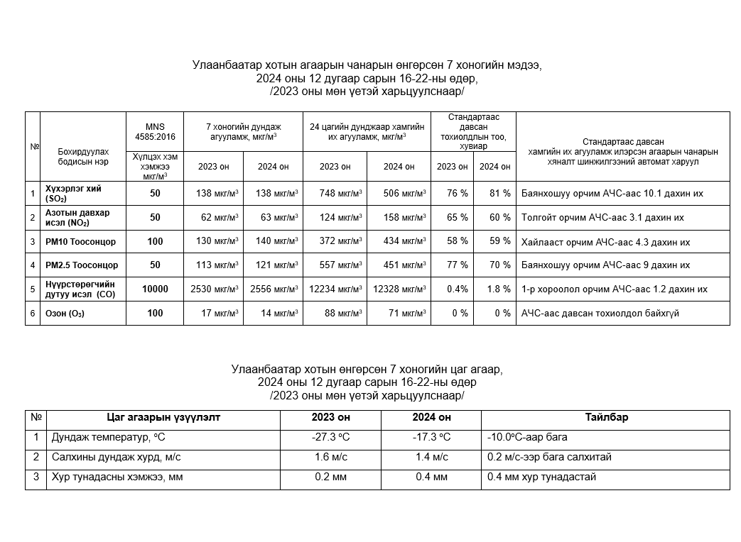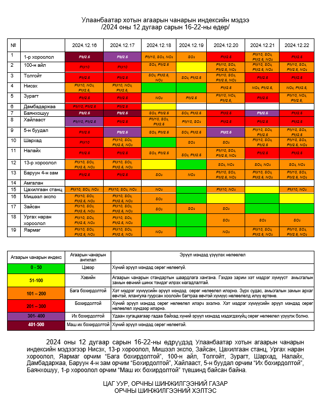 Улаанбаатар хотын агаарын чанарын 7 хоногийн мэдээ /2024.12.16-2024.12.22/