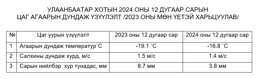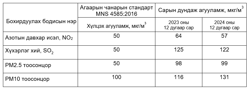 Улаанбаатар хотын агаарын чанарыг гэр хороолол, автозам, орон сууцны хороолол, үйлдвэрийн дүүрэг орчмын 19 цэгт агаар бохирдуулах бодис болох хүхэрлэг хий (SO2), азотын давхар исэл (NO2), РМ2.5, PM10 тоосонцор, нүүрстөрөгчийн дутуу исэл (CO), озон (О3) болон цаг уурын үзүүлэлтүүдийг автомат багажаар тодорхойлж байна. 2024 оны хүйтний улирал 12 дугаар сарын Улаанбаатар хотын агаар бохирдуулах бодисын дундаж агууламжийг өмнөх оны мөн үе 2023 оны 12 дугаар сарын дундаж агууламжтай харьцуулахад азотын давхар исэл (NO2) нь 7 мкг/м3-ээр буюу 11%-иар, хүхэрлэг хий (SO2) нь 3 мкг/м3-ээр буюу 2%-иар тус тус бага. Харин PM2.5 тоосонцор 1 мкг/м3-ээр 1%-иар, PM10 тоосонцор 15 мкг/м3-ээр буюу 13%-иар их байна.