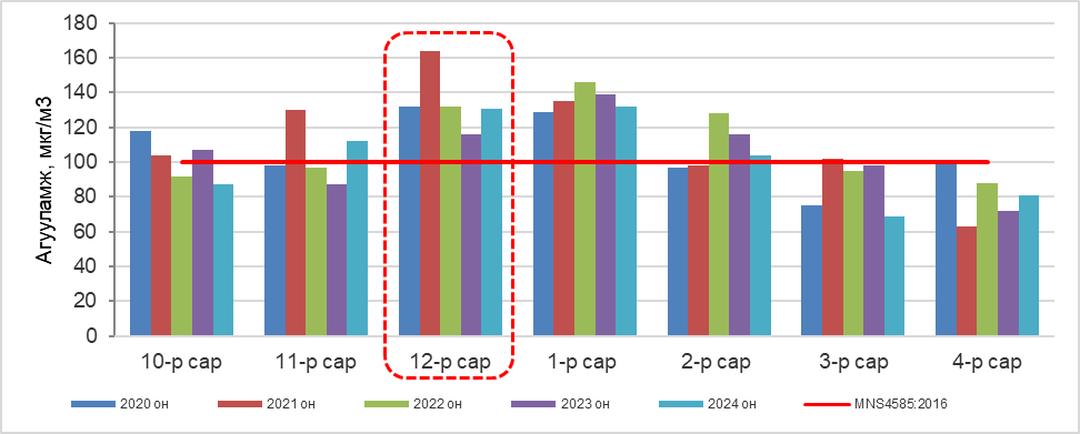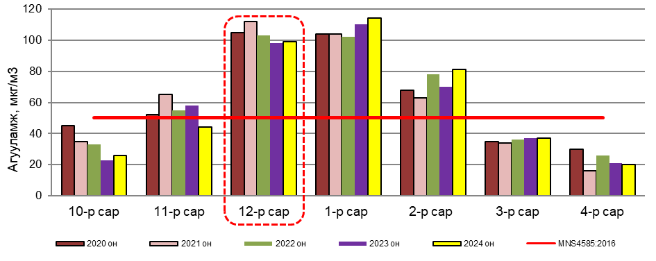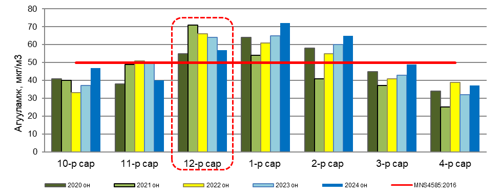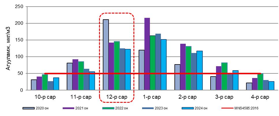 Улаанбаатар хотын агаар дахь PM2.5 тоосонцрын 2024 оны 12 дугаар сарын дундаж агууламжийг өмнөх оны мөн үе буюу 2023 оны 12 дугаар сарын дундаж агууламжтай харьцуулахад 1 мкг/м3-ээр 1%-иар их. Агаарын чанарын стандарт MNS 4585:2016 дахь хүлцэх агууламжаас 49 мкг/м3-ээр их байна. (Зураг 2).