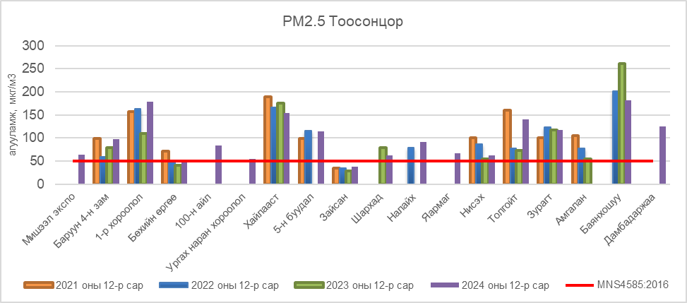2024 оны 12 дугаар сард РМ2.5 тоосонцрын дундаж агууламжийг агаарын чанарын хяналт шинжилгээний харуул тус бүрээр авч үзвэл Мишээл экспо АЧС-аас 14 мкг/м3-ээр их, Баруун 4-н зам АЧС-аас 47 мкг/м3-ээр их, 1-р хороолол АЧС-аас 129 мкг/м3-ээр их, 100-н айл АЧС-аас 33 мкг/м3-ээр их, Ургах наран хороолол АЧС-аас 5 мкг/м3-ээр их, Хайлааст АЧС-аас 104 мкг/м3-ээр их, 5-н буудал АЧС-аас 65 мкг/м3-ээр их, Шархад АЧС-аас 12 мкг/м3-ээр их, Налайх АЧС-аас 41 мкг/м3-ээр их, Яармаг АЧС-аас 17 мкг/м3-ээр их, Нисэх АЧС-аас 12 мкг/м3-ээр их, Толгойт АЧС-аас 90 мкг/м3-ээр их, Зурагт АЧС-аас 67 мкг/м3-ээр их, Баянхошуу АЧС-аас 132 мкг/м3-ээр их, Дамбадаржаа АЧС-аас 75 мкг/м3-ээр их байна. Харин Бөхийн өргөө АЧС-аас даваагүй байна (Зураг 3).