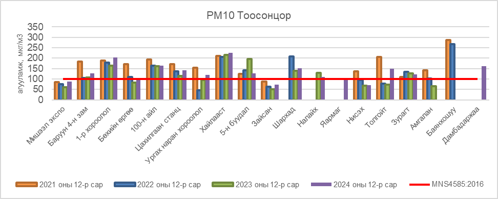 2024 оны 12 дугаар сард РМ10 тоосонцрын дундаж агууламжийг агаарын чанарын хяналт шинжилгээний харуул тус бүрээр авч үзвэл Баруун 4-н АЧС-аас зам 27 мкг/м3-ээр их, 1-р хороолол АЧС-аас 103 мкг/м3-ээр их, 100-н айл АЧС-аас 64 мкг/м3-ээр их, Цахилгаан станц АЧС-аас 41 мкг/м3-ээр их, Ургах наран хороолол АЧС-аас 20 мкг/м3-ээр их, Хайлааст АЧС-аас 125 мкг/м3-ээр, 5-н буудал АЧС-аас 27 мкг/м3-ээр их, Шархад АЧС-аас 52 мкг/м3-ээр их, Налайх АЧС-аас 11 мкг/м3-ээр их, Толгойт АЧС-аас 49 мкг/м3-ээр их, Зурагт АЧС-аас 23 мкг/м3-ээр их, Дамбадаржаа АЧС-аас 62 мкг/м3-ээр их байна. Харин Мишээл экспо, Бөхийн өргөө, Яармаг, Нисэх АЧС-аас даваагүй байна (Зураг 5).