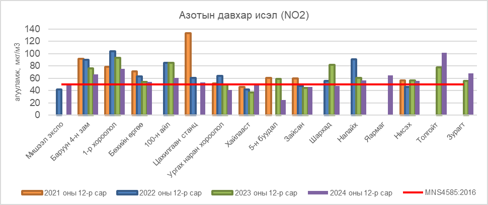 2024 оны 12 дугаар сард Азотын давхар исэл (NO2)-ийн дундаж агууламжийг агаарын чанарын хяналт шинжилгээний харуул тус бүрээр авч үзвэл Мишээл экспо АЧС-аас 2 мкг/м3-ээр их, Баруун 4-н зам АЧС-аас 16 мкг/м3-ээр их, 1-р хороолол АЧС-аас 25 мкг/м3-ээр их, Бөхийн өргөө АЧС-аас 4 мкг/м3-ээр их, 100-н айл АЧС-аас 11 мкг/м3-ээр их, Цахилгаан станц АЧС-аас 3 мкг/м3-ээр их, Налайх АЧС-аас 7 мкг/м3-ээр их, Яармаг АЧС-аас 15 мкг/м3-ээр их, Нисэх АЧС-аас 6 мкг/м3-ээр их, Толгойт АЧС-аас 51 мкг/м3-ээр их, Зурагт АЧС-аас 18 мкг/м3-ээр байна. Харин Ургах наран хороолол, Хайлааст, 5-н буудал, Зайсан, Шархад АЧС-аас даваагүй байна (Зураг 7).