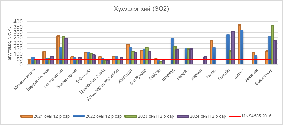 2024 оны 12 дугаар сард хүхэрлэг хий (SO2)-н дундаж агууламжийг агаарын чанарын хяналт шинжилгээний харуул тус бүрээр авч үзвэл Баруун 4-н зам АЧС-аас 29 мкг/м3-ээр их, 1-р хороолол АЧС-аас 196 мкг/м3-ээр их, Бөхийн өргөө АЧС-аас 17 мкг/м3-ээр их, 100-н айл АЧС-аас 42 мкг/м3-ээр их, Ургах наран хороолол АЧС-аас 20 мкг/м3-ээр их, Хайлааст АЧС-аас 65 мкг/м3-ээр их, 5-н буудал АЧС-аас 74 мкг/м3-ээр их, Шархад АЧС-аас 91 мкг/м3-ээр их, Налайх АЧС-аас 95 мкг/м3-ээр их, Яармаг АЧС-аас 23 мкг/м3-ээр их, Толгойт АЧС-аас 261 мкг/м3-ээр их, Баянхошуу АЧС-аас 178 мкг/м3-ээр байна. Харин Мишээл экспо, Цахилгаан станц, Зайсан АЧС-аас даваагүй байна (Зураг 9).