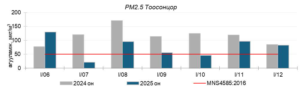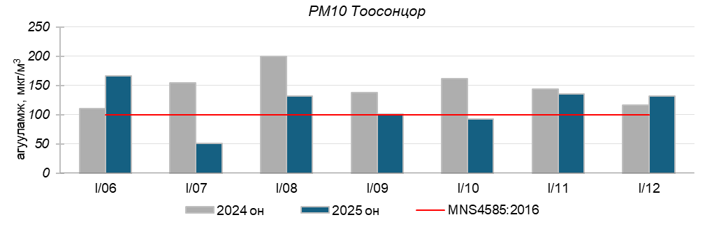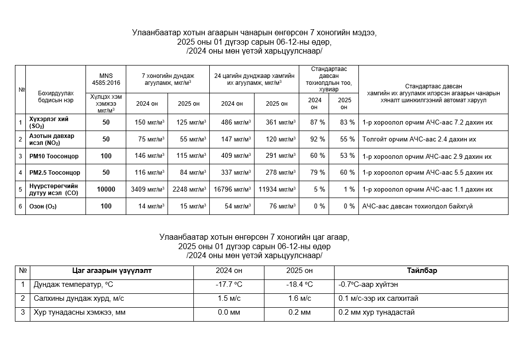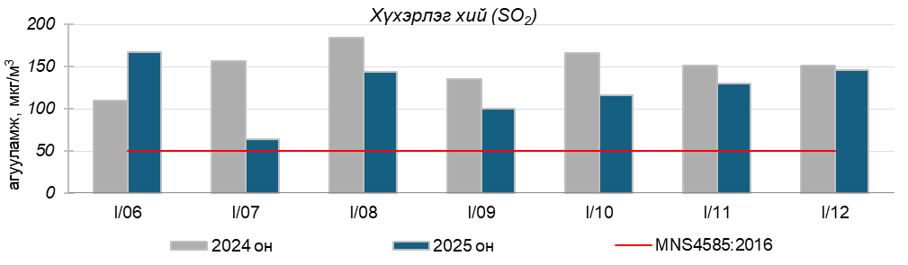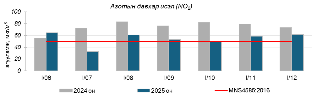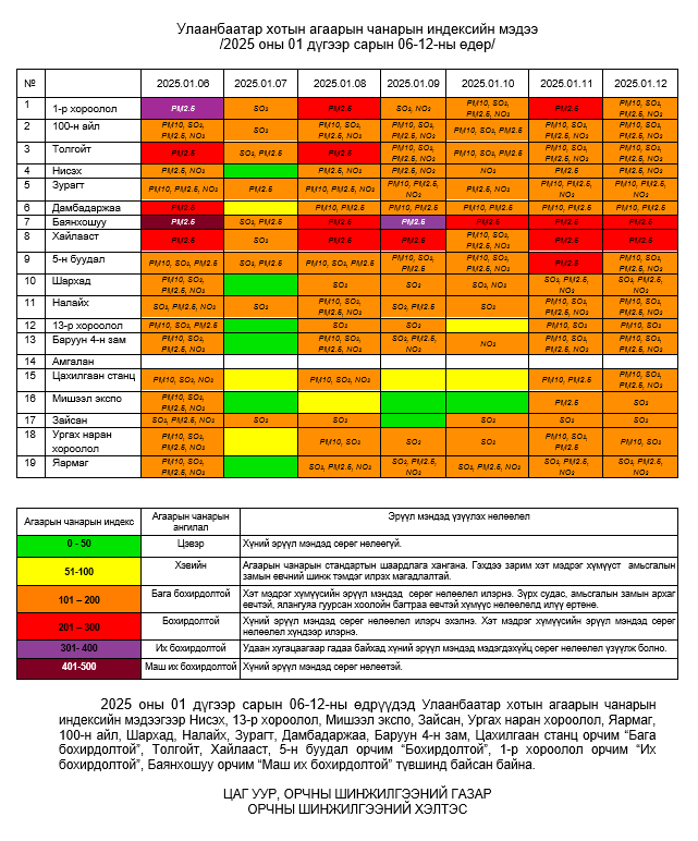 Улаанбаатар хотын агаарт түгээмэл бохирдуулах бодис хүхэрлэг хий /SO2/, азотын давхар исэл /NO2/, тоосонцор /PM10, PM2.5/, нүүрстөрөгчийн дутуу исэл /CO/, озон /O3/-ны агууламжийг тодорхойллоо.