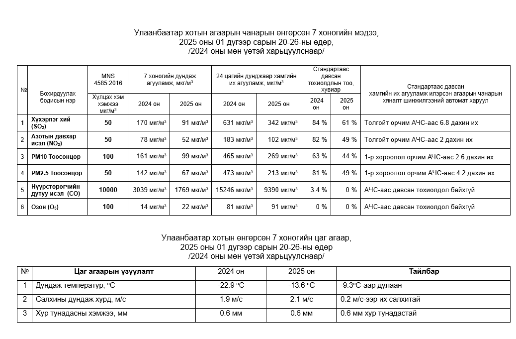Улаанбаатар хотын агаарын чанарын 7 хоногийн мэдээ /2025.01.20-2025.01.26/