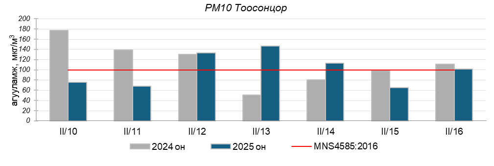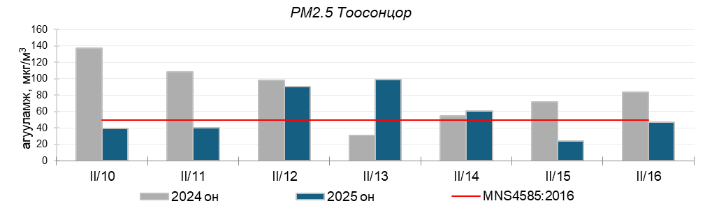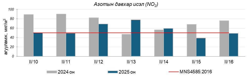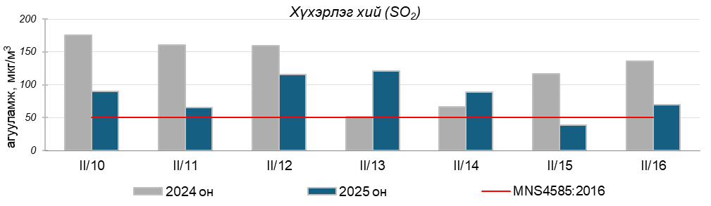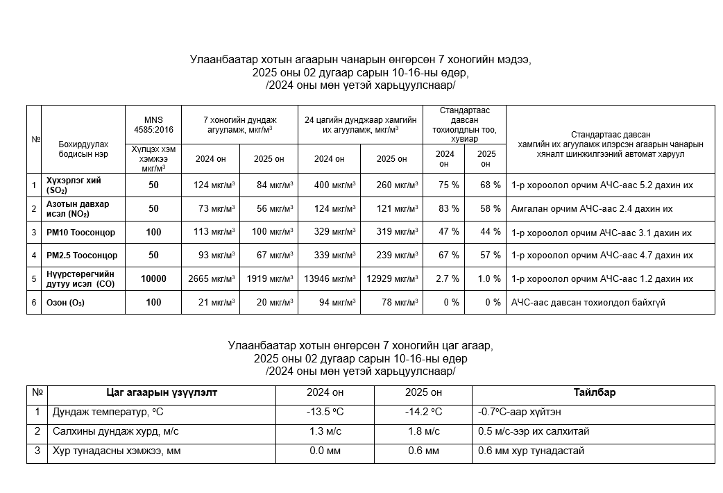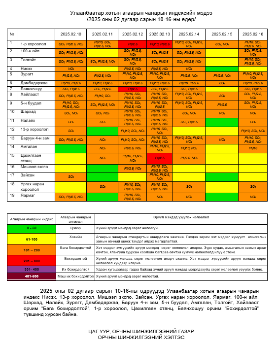 Улаанбаатар хотын агаарт түгээмэл бохирдуулах бодис хүхэрлэг хий /SO2/, азотын давхар исэл /NO2/, тоосонцор /PM10, PM2.5/, нүүрстөрөгчийн дутуу исэл /CO/, озон /O3/-ны агууламжийг тодорхойллоо.